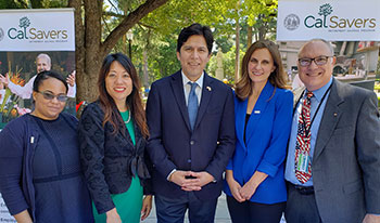 Treasurer Fiona Ma, former state Senator Kevin de Leόn, and CalSavers Executive Director Kate Selenski, flanked by staff members Akilah Jones and Mark DeSio, at the formal launch of the retirement savings program for private sector workers in July.
